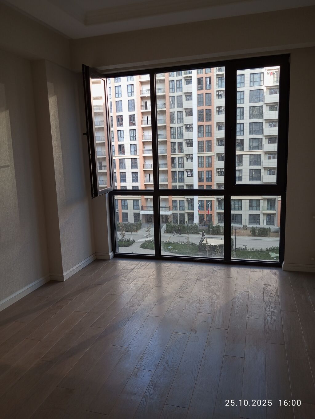 - Böyük panoram pəncərələr, həyətə və kompleksə baxış; bir otaqda fransız balkon tipli pəncərə‑qapı.